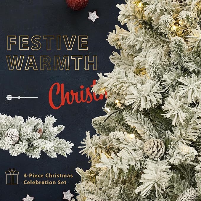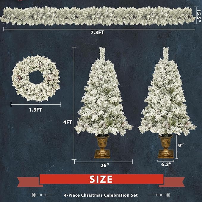 - 2 Pack Christmas Tree with Wreath & Garland - Embrace the joy of the holiday season into your home with the prelit Christmas tree set of 4. The 4-piece prelit Christmas trees set features two 4ft Christmas trees, one wreath, and one 9ft garland, trimmed with frosted pine cones that will make a welcoming addition to a doorway, porch or foyer.