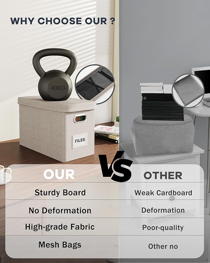 - 【Sturdy & Stackable】Portable storage box is made of well-made linen fabrics and durable material, with good support and bearing capacity, and the box top can withstand 100 lbs. The document boxes can be stacked when in use, or folded for easier storage when not in use.