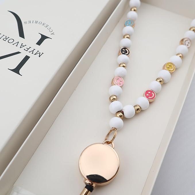 Smile Teacher Lanyard for Women with Retractable ID Badge Reel and Keychain Cute Happy Beads Lanyard