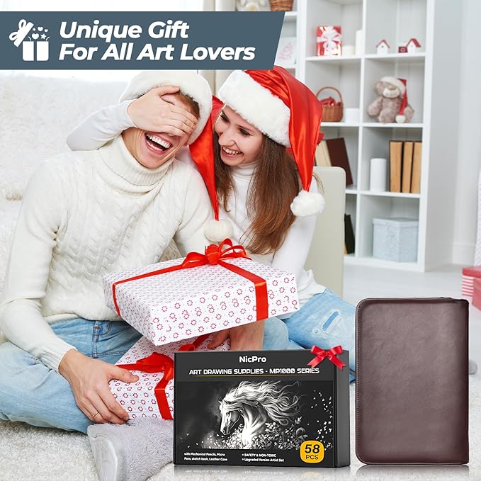 Nicpro 58PCS Art Drawing Supplies Kit in Leather Case, MP1000 Black Metal Mechanical Pencil Set with Drafting Pencil 0.5, 0.7, 0.9 & 2mm, 12 Micron Pen, Sketch Book, 30 Tube Lead Refills for Sketching
