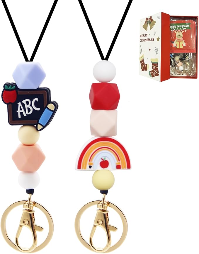 2 PCS Teacher Lanyards for ID Badges and Keys,Cute Silicone Bead Lanyard with Keychain,Teacher Lanyard Breakaway with Christmas Gift Box for Women Nurse Employee Student