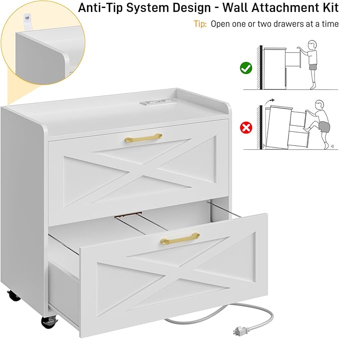 Lateral File Cabinet 2 Drawer Mobile File Cabinet with Charging Station for Legal/Letter/A4 Size Hanging Files, Modern Farmhouse Large Wood File Storage Cabinet for Home Office Furniture(Simple White)