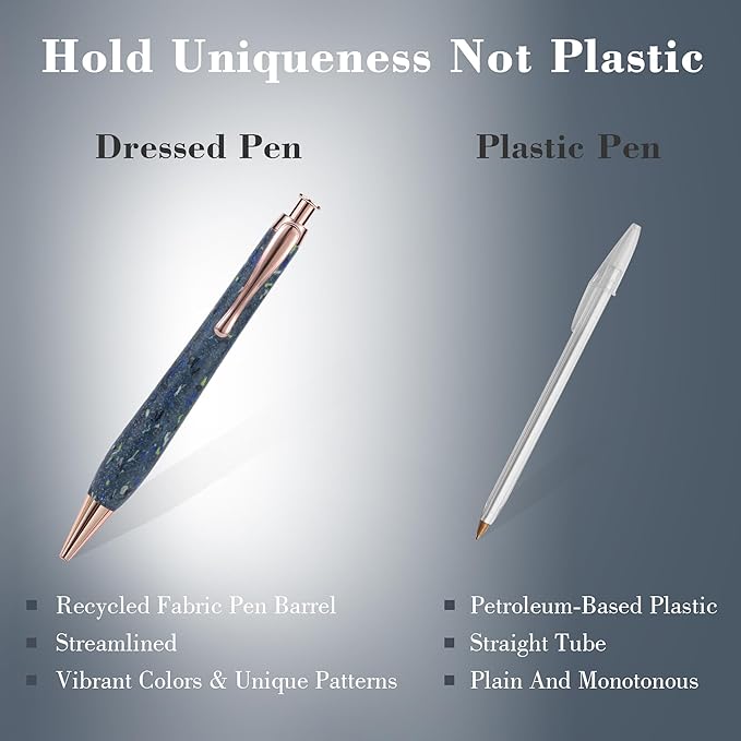 - Elegant, Refillable: Made with recycled fabric and refillable black ink, this pen is a sustainable yet luxurious choice. A perfect blend of eco values and timeless function in one beautiful writing tool