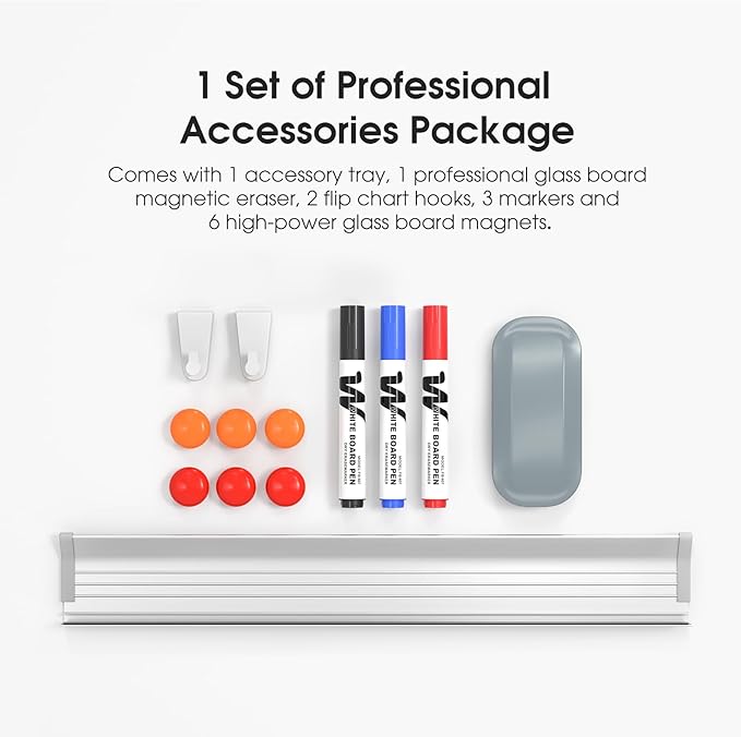 - 15-Minute Easy Installation with Complete Accessories: Comes with an installation template, accessory tray, premium magnetic glass board eraser, 3 markers, and 6 strong glass board magnets; setup is easy within approximately 15 minutes for horizontal or vertical mounting