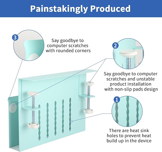 - Multifunctional Desk Side Storage & Anti -Slip And Anti -Scratch Design: This laptop holder can be retrofitted to the side of a desk to easily hold a laptop, tablet, hidden wires, interior accessories, manuals, documents, notebooks, and other items. On the inner surface of our desk side storage rack, the bottom and ends of the clamp have a non-slip sheet, which can help secure laptop in desk side hanging storage to avoid scratching desktop laptops, tablets or other devices
