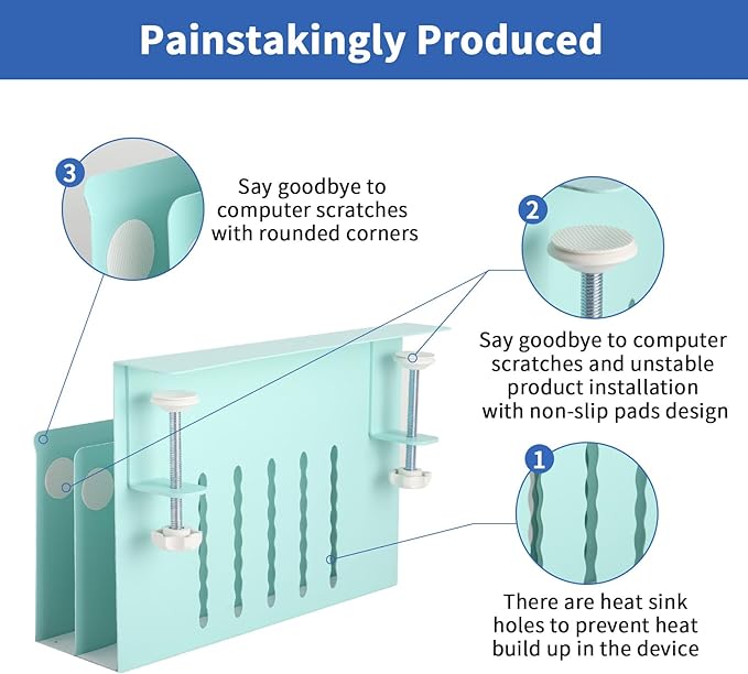 - Multifunctional Desk Side Storage & Anti -Slip And Anti -Scratch Design: This laptop holder can be retrofitted to the side of a desk to easily hold a laptop, tablet, hidden wires, interior accessories, manuals, documents, notebooks, and other items. On the inner surface of our desk side storage rack, the bottom and ends of the clamp have a non-slip sheet, which can help secure laptop in desk side hanging storage to avoid scratching desktop laptops, tablets or other devices