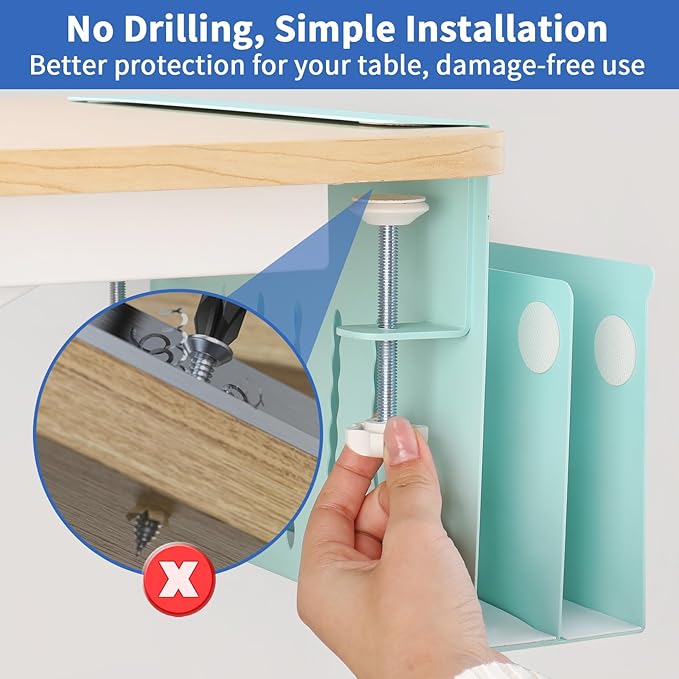 - No Drilling & Easy To Install: Our no drill desk side storage, laptop holder under desk is easy to install. And the silicone cushion can prevents scratches on desks and other objects, the rounded corners design can also avoid scratches. No extra tools are needed and importantly it won't damage your desk. (Note: Before purchasing, please confirm whether the upper and lower edges of the sides of your desk are flat and whether the size is suitable for your desk. You can refer to our pictures to confirm whether our side of desk storage is suitable for your desk.)