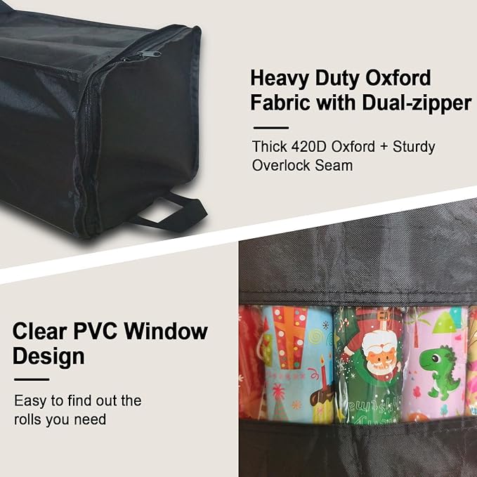 - 【UPGRADED Design】In addition to sturdy handles for carry, outer pockets for wrapping tools, and double-end zippers, transparent PVC is also added to make your paper roll clearly visible. You can easily find the paper roll you need.