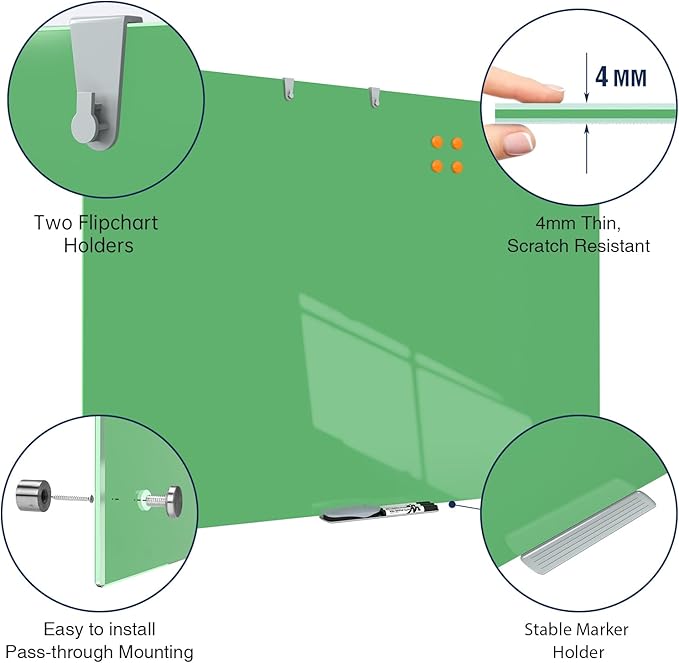 - PREMIUM GLASS WHITEBOARD - 36 x 48 inches glass whiteboard comes with smooth, strong and durable tempered glass surface, which is resists scratches and dents. This premium glass allows you to write, erase and rewrite on a clean surface every time.