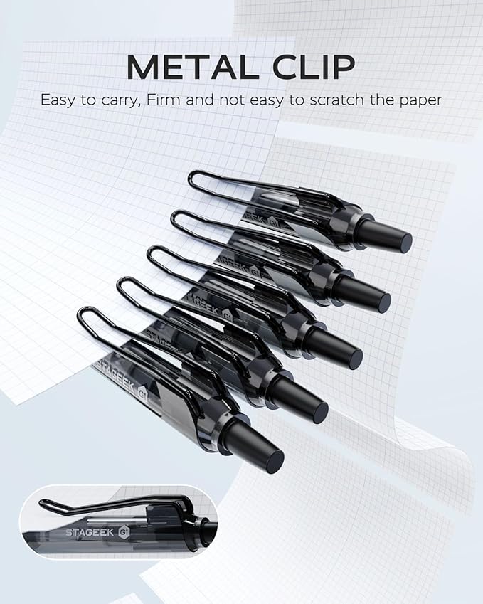- [Metal Clip]: STAGEEK black gel pens metal clip design,more stronger, more durable, and grips tighter. These black gel pens can easy to securely attach to notebooks or pockets. The fine point pen designed for convenient carry, you’ll never lose these 0.5 gel pens