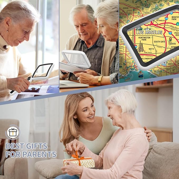 - Touch Switch & Adjustable Lighting: The full page magnifier has 12 super-bright LEDs. Easily illuminate your reading material. Simply touch the on/off switch on the magnifier handle to set the desired brightness easily. The LEDs provide bright, even light to ensure every detail is visible, reducing eye fatigue and improving the overall viewing experience. A perfect aid for seniors suffering from ageing eyes and macular degeneration.