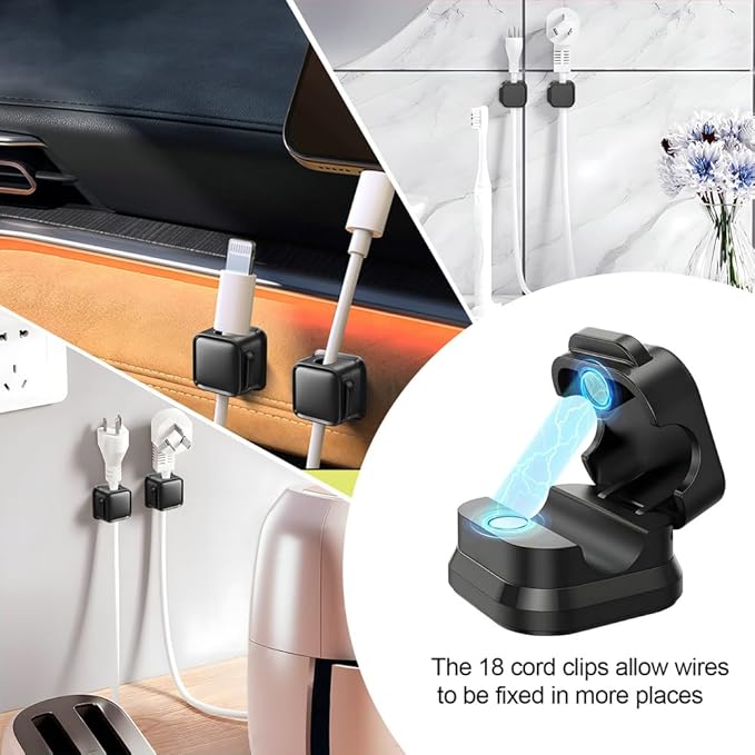 18 Pack Cord Organizer Holder,Magnetic Cable Clips Management, Easy Adhesive Phone USB Charger Cord Keeper, Hide Or Organize Desk Cable for Kitchen, Office, Car, Nightstand (Black)