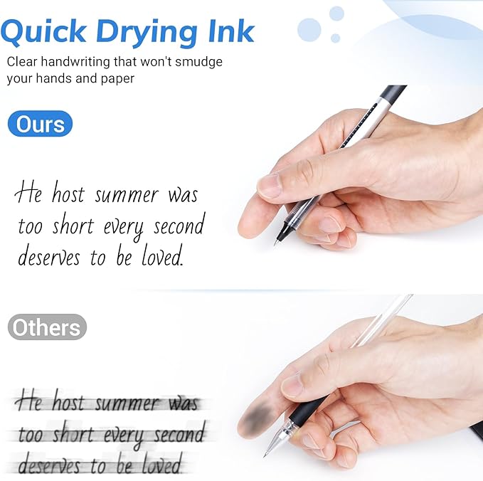 - High Quality Black Fine Tip Pens Pack: These black extra fine point pens use premium high quality pen ink, quick-drying without ink overflow, no smudging and no bleeding when exposed to water, and not easy to penetrate the paper that help you keep extra fine gel pens for note taking clean and organized, so these pen ballpoint smooth writing pens fine point are so mess-free and suitable for many groups, students, teachers, business people, etc