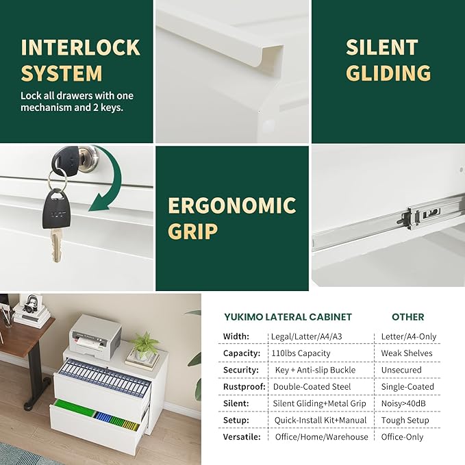- 【Anti-tilt System】: This 2 drawer lateral file cabinet with lock meet your needs. It has has a anti-tilt design, ensuring that only one drawer can be open at a time. By preventing multiple drawers from being open simultaneously, the office cabinet maintains stability and greatly reduces the risk of tipping. You can have peace of mind knowing that your documents and equipment are secure.