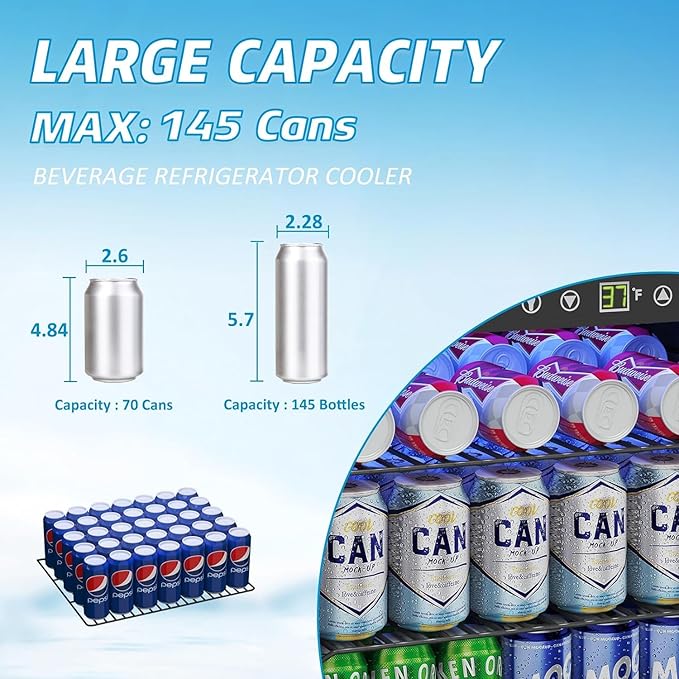 - With its large internal storage design, this under-counter beverage cooler can hold up to 145 standard sized soda or beer cans, or several bottles of wine. It comes with 7 adjustable and removable chrome shelves to organize your drinks conveniently