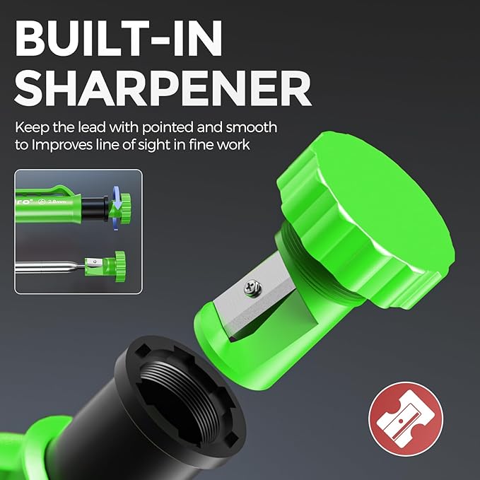 - Carpenter Pencils with Sharpener: The sharpener is screwed into the top of the work pencil, which won't get lost either. Built-in pencil sharpener that keep the lead with pointed and smooth to Improves line of sight in fine work