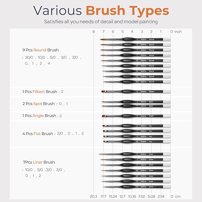 - All-in-One Detail Paint Brush Set – 24 Sizes for Every Precision Task. This miniature paint brush set includes 24 brushes in a full range of shapes and sizes: Liners (10/0–2), Rounds (20/0–4), Flats (2/0–2), Angle (3), Filbert (2), Spot (0, 1). Whether you're painting fine lines, tiny highlights, or delicate curves, you’ll always have the right detail paint brush at hand—perfect for miniatures, scale models, and intricate artwork