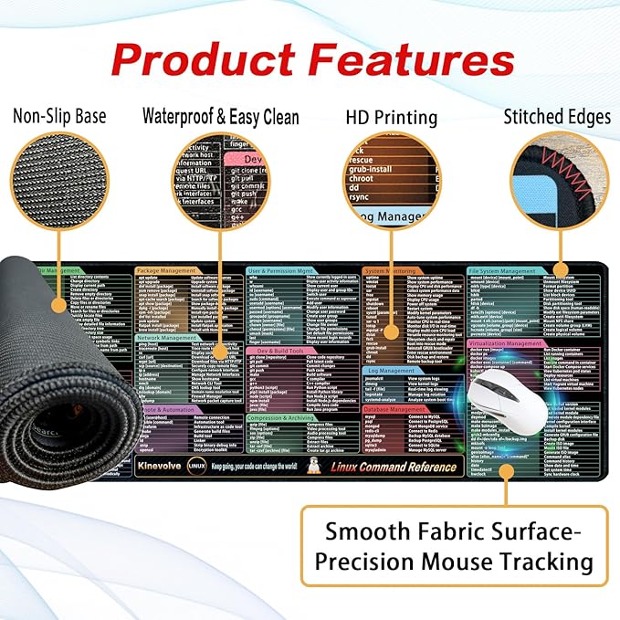 - Linux Command Collection: This mouse pad features a wide range of Linux shortcuts and commands to help improve work speed and efficiency, making it ideal for both beginners and experienced users.