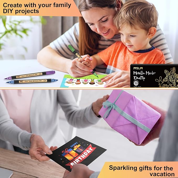 - High Quality: Unlike traditional metallic pens, this one doesn't need to be shaken or pressed down on the nib to be used! Just uncap and start creating! Our glitter metallic marker pens have opaque ink formula, non-toxic, odorless and environmentally friendly. Extremely smooth, water-based ink dries quickly and is chemically stable and resistant to fading.