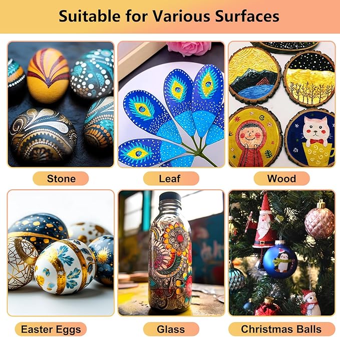 - Special Gift: The glitter metallic marker pens are suitable for newcomers to play creative, Acrylic paint pens art supplies will be a personalized gift for your loved ones and painting rock lovers and create amazing art gifts for birthdays, Easter, Halloween, Christmas, Valentine's Day, Thanksgiving, New Year or special holiday gifts. design your own Christmas decorations, Halloween pumpkins, scrapbook supplies, wedding guest book, photo album or thank you card. High-quality felt tip pens make art interesting and easy. Perfect for different occasions.