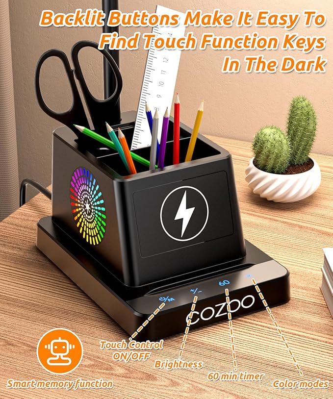 - LED Desk Lamp with Wireless Charger & RGB Atmosphere Light : This modern black desk lamp with wireless charger delivers 15W fast charging for compatible smartphones, including iPhones and Samsung devices. A perfect lamp for dorm, home office, or college desk setups.
