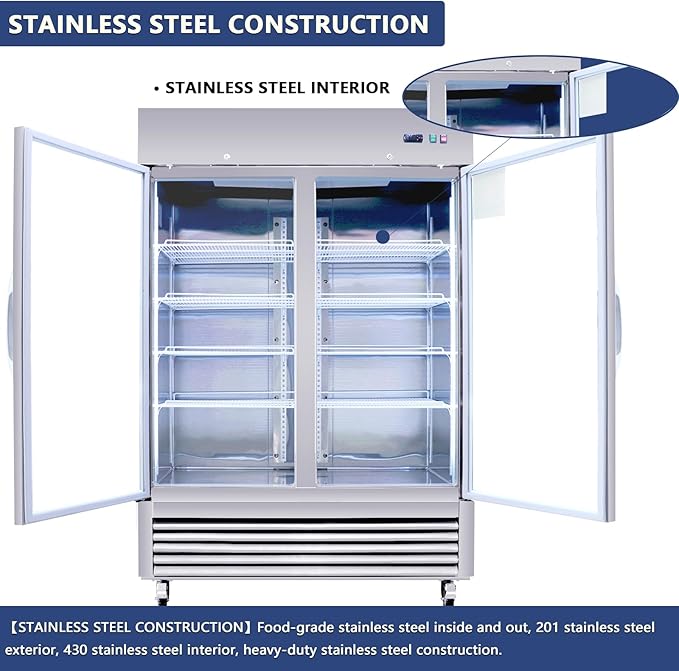 - This reach in refrigerator has heavy-duty stainless steel construction, food-grade stainless steel inside and out, which does not leave fingerprints, 2 reach in solid doors, closing the door automatically when the opening angle is less than 90 degrees. When the opening angle is more than 90 degrees, the door will remain open. It comes with 8 shelves, each one can hold up to 66 lbs, 4 heavy duty casters, and 2 of them have brakes, safety lock and 42.2 cu.ft storage space