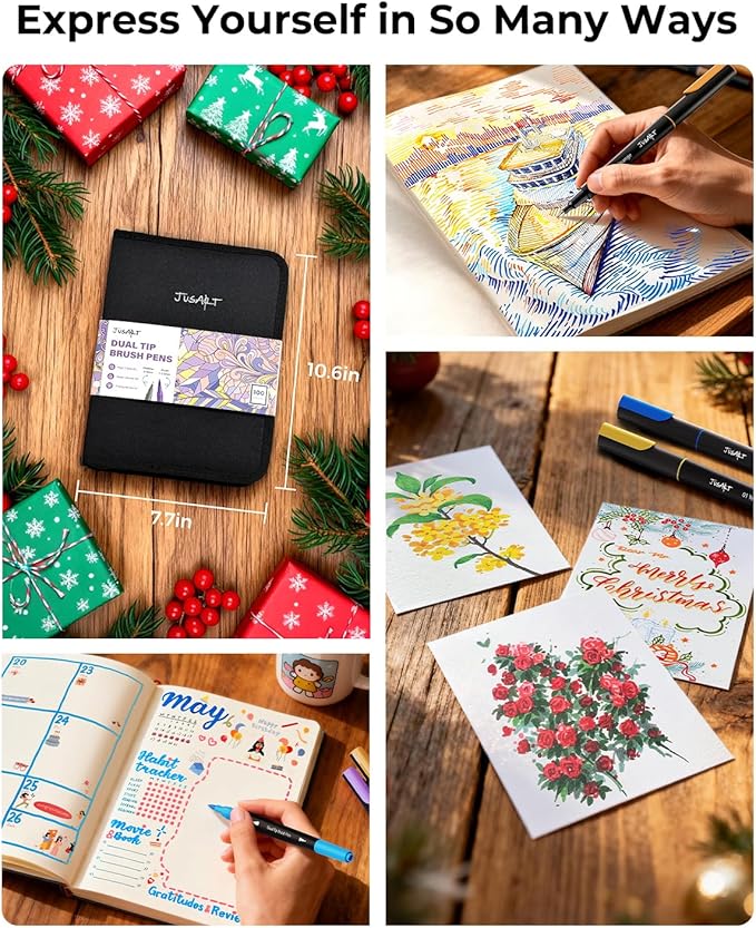 JusArt Markers for Adult Coloring Books No Bleeding, Coloring Markers with Dual Tips, Fine & Brush Pens with Ergonomic Triangle Grip & 33% More Ink, Water-Based Art Drawing Set for Adults, 100 Colors