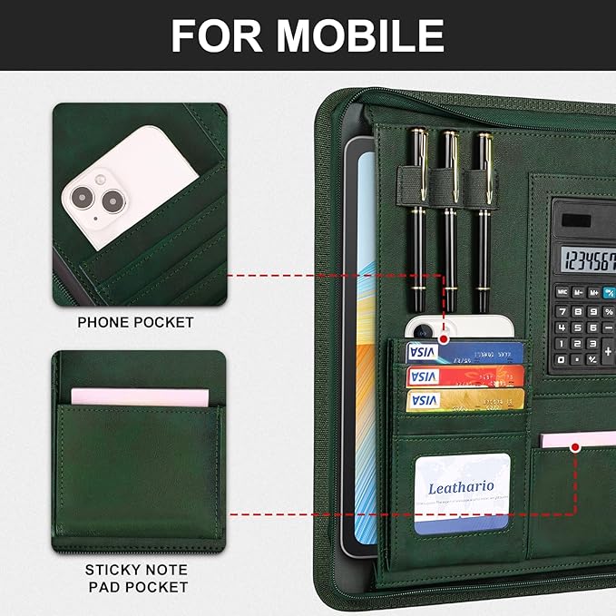 - MULTIFUNCTIONAL STRUCTURE - This versatile portfolio binder features a left section with document and PAD compartments, card slots, Mobile phone compartment, a detachable calculator, 3 pen holders to meet all your organizational needs