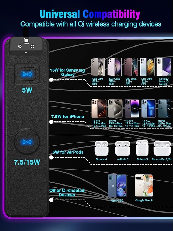 - All-in-One Desk Mat Mousepad: 15W Magnetic Fast Wireless Charging Mouse Pad for Samsung Galaxy S23/S22/S21/S20/S10/S9/S8/Note 9/8, iPhone 17/16/15/14/13/12/11/X/8 series, Airpods Pro 2nd/Pro/4rd/3rd/2rd(only for wireless charging case) and other Qi-enabled devices. (Note: 15W fast charging requires 18W/20W Power Adapter, which is not included in the this Mousepad.)