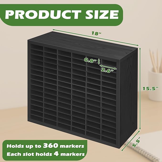 - 【Organize Like a Pro】Whether you're a professional artist, a passionate crafter, or a classroom educator, this premium wooden marker organizer is your ultimate storage solution. With 90 generously sized slots that each hold up to 4 markers, it keeps up to 360 markers neatly sorted, visible, and within arm's reach—so you can spend more time creating and less time searching.