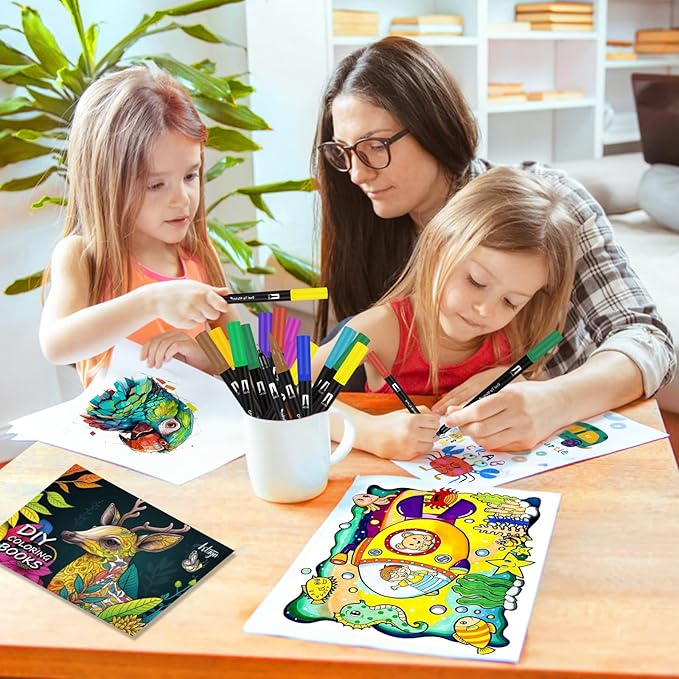 - PORTABLE DESIGN: Our brush pens are packed in a PORTABLE STORAGE CASE which have pen slots to organize all your colors. Those double-end pens are use in school, travel or in the home and office.The kits includes 1 x Portable Case, 120 x Coloring Markers, 1 x DIY Coloring Book, 3 x Bonus Brush Tips & 3 x Bonus Fineliner Tips.