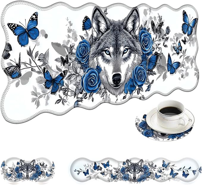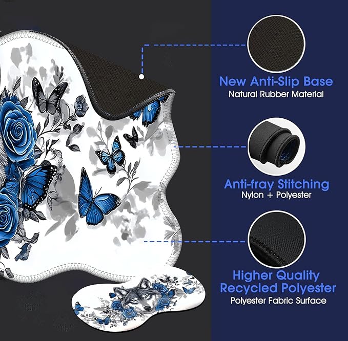 Large Mouse Pad and Keyboard Wrist Rest, Desk Pad for Keyboard and Mouse, 4-in-1 Large Gaming Mouse Pad with Wrist Support, Desk Mat for Home Office Study Game-Wolf Butterflies