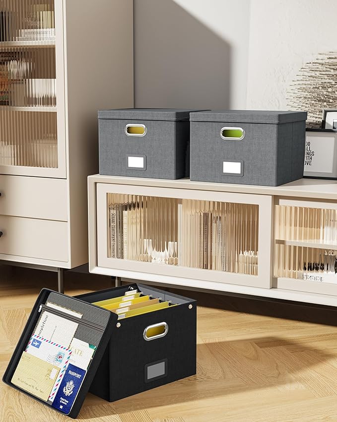 - 【Sturdy & Stackable】Portable storage box is made of well-made linen fabrics and durable material, with good support and bearing capacity, and the box top can withstand 100 lbs. The document boxes can be stacked when in use, or folded for easier storage when not in use.