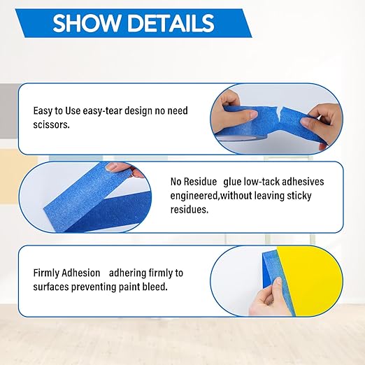 - Easy to Use: Our blue tape painters is easy to use. No scissors are needed. You can simply tear it with hands. Meanwhile Our blue painters tape is designed for clean removal without leaving any sticky residue behind. No mess, no damage, just smooth, professional results.