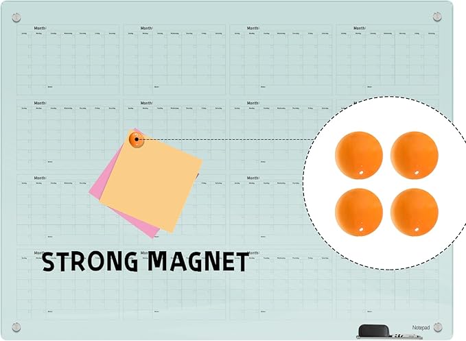 Magnetic Glass Dry Erase Board Calendar- White Board 48 x 36 Inch Wall Mounted Yearly Whiteboard, Large Frameless Glass White Board for Wall Office, Home & School