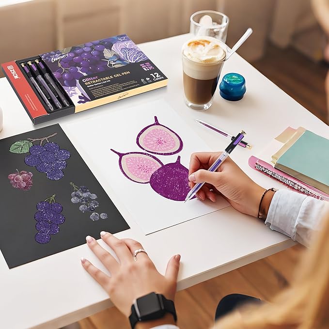 - Perfect Gift & Portable Storage:This 12-piece retractable glitter gel pen set comes in a deluxe drawer-style box with molded tray to securely hold each glitter pen. Perfectly packaged for gifting to artists, crafters, and stationery enthusiasts. The anti-slip tray keeps pens organized whether at home, office, or on-the-go - ready to spark creativity anytime!
