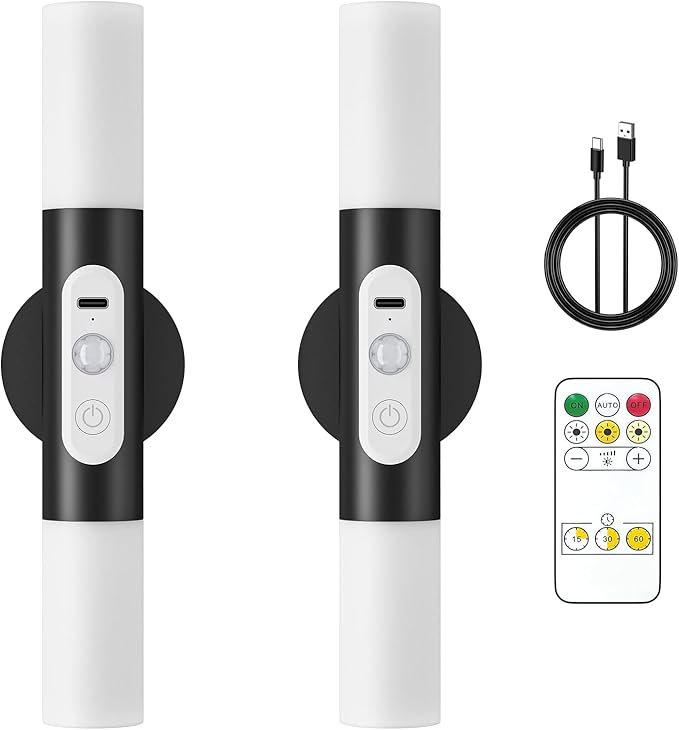 Motion Sensor Wall Lights with Remote Control, LED Rechargeable Battery Operated Wall Sconces Set of Two for Bedroom, Indoor Wireless Wall Lamps for Living Room, Hallway, Stair, Black 2 Pack