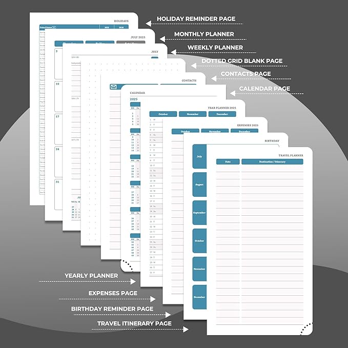- Multi function Page: Personalized planner system. Year plan pages, holiday reminders, birthday record area for relatives and friends; set up storage contacts, and record inspiration and plans with the dot matrix note area; at the same time, work planner can travel planning and expense management modules to achieve coordination of schedule and finance
