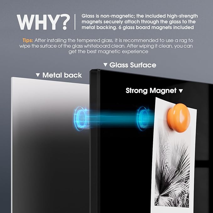 - Magnetic Steel-Backed Surface: The thick tempered glass requires high-powered magnets for proper adhesion. we provide 6 strong neodymium magnets to ensure a firm and reliable hold—perfect for displaying documents, reminders, or visuals