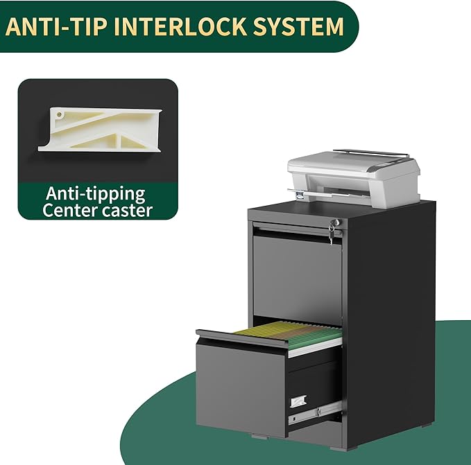 - 【Privacy Security and Anti-tilt Design】The interlock system secures the 2 drawers and comes with two keys to protect your files. The anti-tilt system ensures that only one drawer can be open at a time, preventing the metal file cabinet from tipping over. You can have peace of mind knowing that your important documents and items are safe and secure.