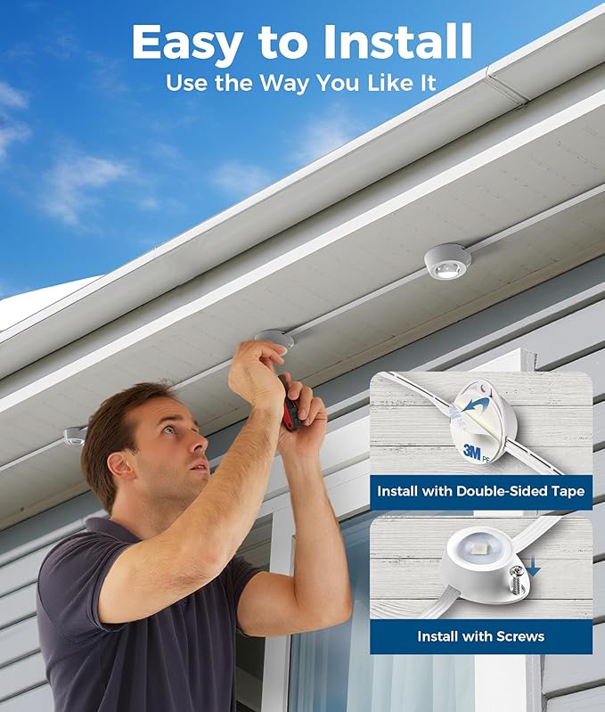 - Easy Installation: The total length of the entire light string is 115ft, and the power adapter is 14.76ft away from the light string(contains an 8.23ft extension cord, allowing you to flexibly adjust as needed), light string is 100ft, 15 light heads per string, for a total of 4 strings. Power supply with up to 90 light heads. Durable PC+ABS lights with anti-UV coating feature reliable adhesive backing for worry-free installation. Also comes with a screw hole for added reinforcement. Clean the surface, peel off the backing, and firmly press for 5 seconds to install the lights 2-4 inches away from the wall surface. Lighting up your home with permanent house lights outdoor for every occasion