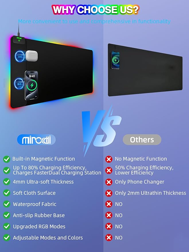 - Special Feature : Dual Wireless Charging Station, Magnetic Charging Mouse Pad, Massive, Premium Surface & Base, Newest RGB Lighting & One-Touch Control, Odor-Resistant, Fade-Resistant, Heat-Resistant, Stain-Resistant, Scratch-Resistant, Anti-Fray, Waterproof, Non-slip, Smooth Surface Dual Wireless Charging Station, Magnetic Charging Mouse Pad, Massive, Premium Surface & Base, Newest RGB Lighting & One-Touch Control, Odor-Resistant, Fade-Resistant, Heat-Resistant, Stain-Resistant, Scratch-Resistan… See more