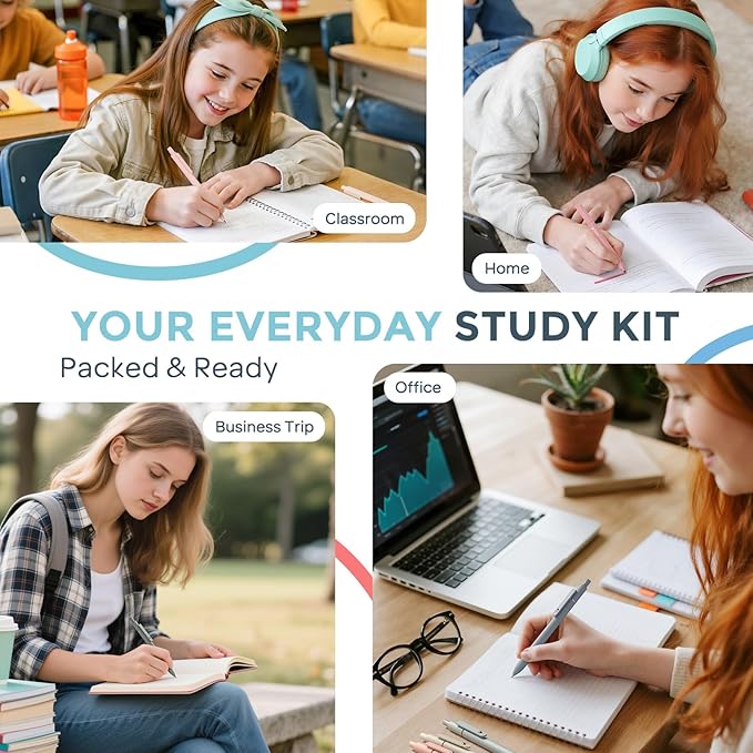 - All-in-One 39 PCS Stationary Set - Covers Every Writing & Highlighting Need:This pen pencil set includes 12 pastel highlighters assorted colors (with eye-friendly, vibrant yet soft hues), 6 mechanical pencils (mix of 0.5mm, 0.7mm and 0.9mm tips to fit precise writing, sketching and drafting), 5 black ink gel pens + 5 extra pen refills, 3 erasers + 9 cap eraser refills, 6 tubes of HB lead refills and a cute blue pencil pouch. It's a one-stop solution for students (middle school to college) teen, office workers and journaling enthusiasts