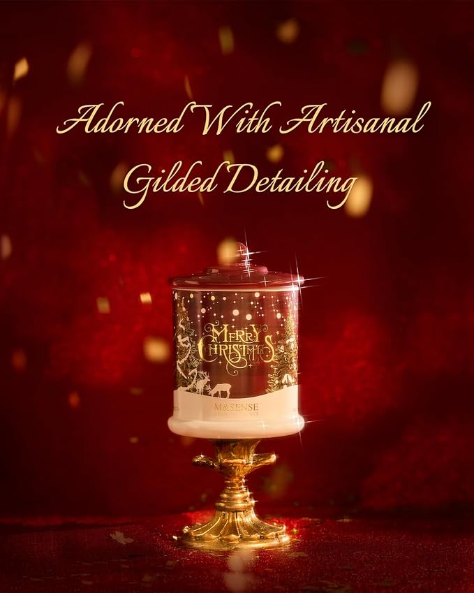 - Christmas Decor: This candle draws inspiration from classic Christmas aesthetics, featuring a glass container modeled after a tea caddy and adorned with luxurious gold foil designs of reindeer, Christmas trees, and snowflakes. When illuminated, the design casts a warm, magical winter scene, perfect for enhancing holiday decor. The metallic accents and rich colors evoke a sense of traditional elegance, making it a stunning decorative piece for mantels, dining tables, or festive gatherings.