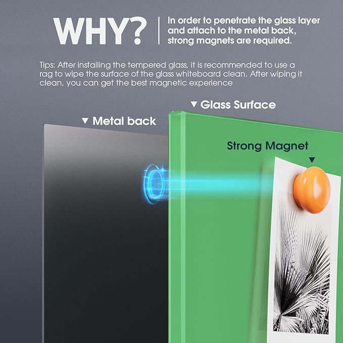 - Magnetic Steel-Backed Surface: The thick tempered glass requires high-powered magnets for proper adhesion. need strong neodymium magnets to ensure a firm and reliable hold—perfect for displaying documents, reminders, or visuals