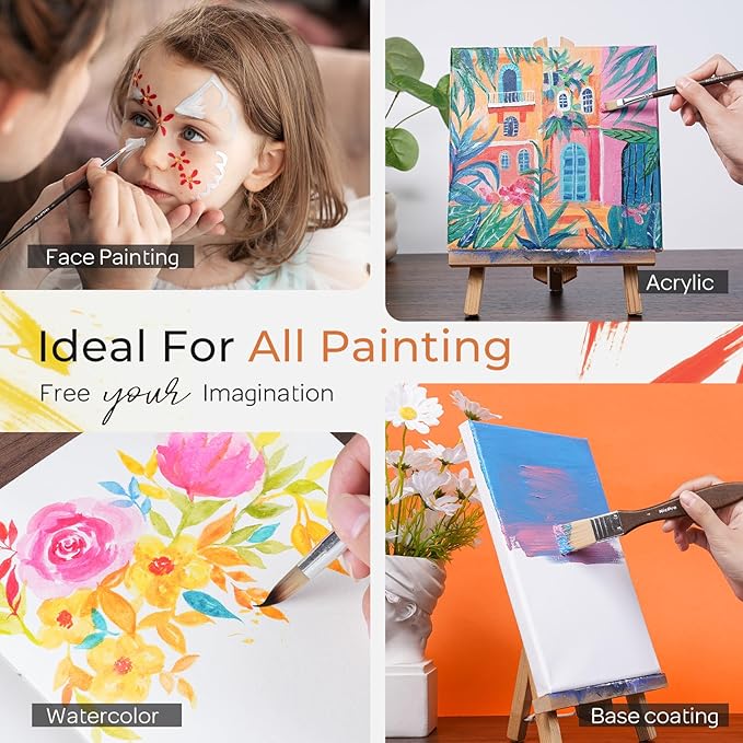 - For Artists of All Levels & Multiple Mediums - A must-have paint brush set for beginners, hobbyists, and professional artists alike. Works beautifully with acrylic, oil, face paint and watercolor paints for canvas painting, craft projects, decorative details, or DIY projects—making every painting session easier and more enjoyable