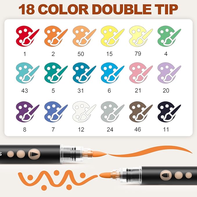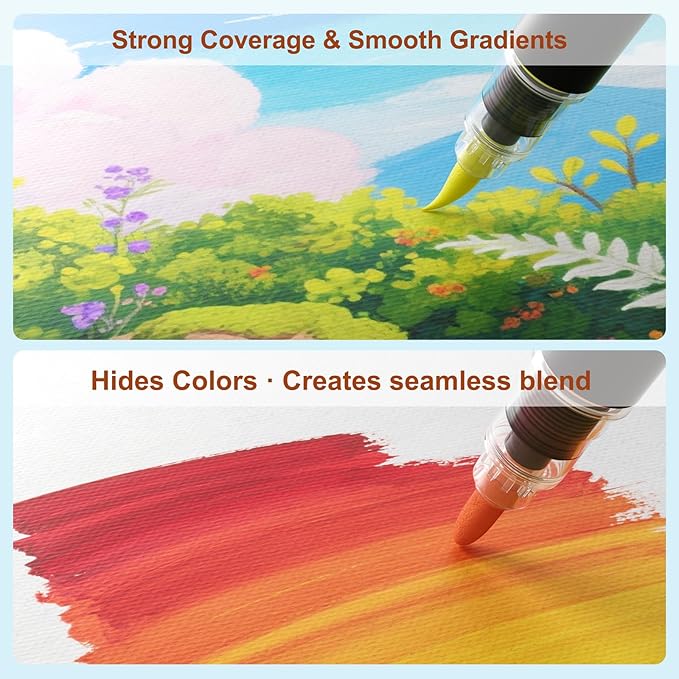 - Dual Tip Acrylic Paint Markers: One end features a precise 1mm bullet tip for outlining and fine details, while the other offers a flexible brush tip for broad strokes and coloring. This dual-tip acrylic markers set is the ultimate art supplies kit for everything from detailed illustrations to bold lettering.