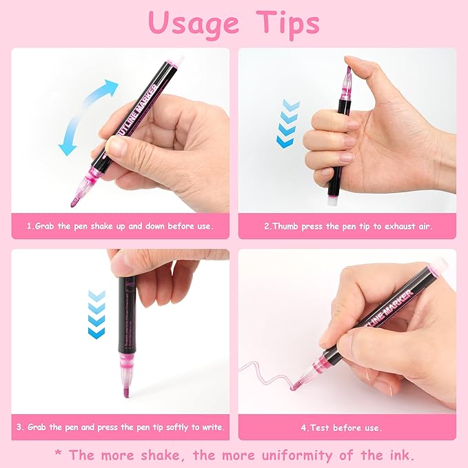 - Easy to use: These self outline markers is very easy to use. Before opening the cap, First shake the marker well so the ink mixes with the tip, then remove the cap and gently press the tip on the paper for a few seconds until the ink flows to the tip, then start creating.