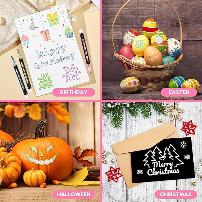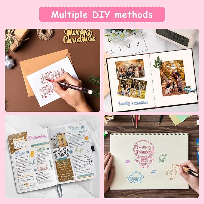 - Wide Application: The shimmer metallic marker set is nice for creating artwork, writing letters, greeting cards, Christmas cards, scrapbook, handicrafts, posters, painting and notes-taking. Also suitable for almost any surface, such as metal, pottery, wood, rubber, glass, plastic, stone etc.They make an ideal gift ideas for Birthday Day, Christmas, Children's Day, birthdays, Easter, and as tween stockings stuff fillers.