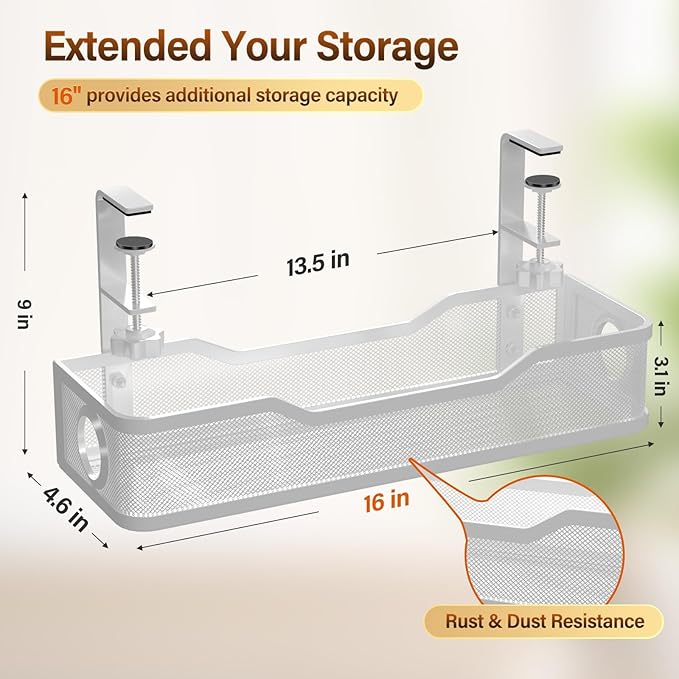 - No Need to Drill Holes - Instead of damaging your desk, our under desk cable management tray can be hung directly onto desk frames and adjust the position as easily as you like, unlike other screw installations.The wire management, following thorough welding and powder coating, offers resistance to rust and dust accumulation, ensuring dependable long-term use under the desk.